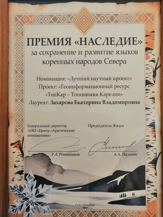 С.н.с. сектора языкознания Е.В.Захарова - лауреат премии "Наследие" за сохранение и развитие языков коренных народов Севера. Проект "Геоинформационный ресурс "ТопКар - Топонимия Карелии"" стал победителем в номинации "Лучший научный проект". Церемония вручения премии, организованная Представительством Ямало-Ненецкого автономного округа в Санкт‑Петербурге и АНО «Центр «Арктические инициативы», прошла в рамках VI научно-практической конференции «Фестиваль языков народов Севера»